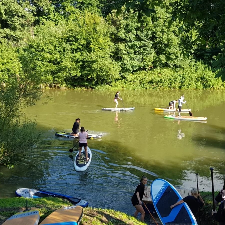 Nach der ein oder anderen Anfangsschwierigkeit und wackeligen Aufstiegen gewöhnten sich alle schnell an ihr Board und es ging auf dem Neckar los Richtung Eberhardsbrücke. Der Hinweg entlang der Neckarinsel gestaltete sich noch sehr entspannt, die einzige Schwierigkeit lag hierbei, den Stocherkähnen und Tretboten unfallfrei auszuweichen.